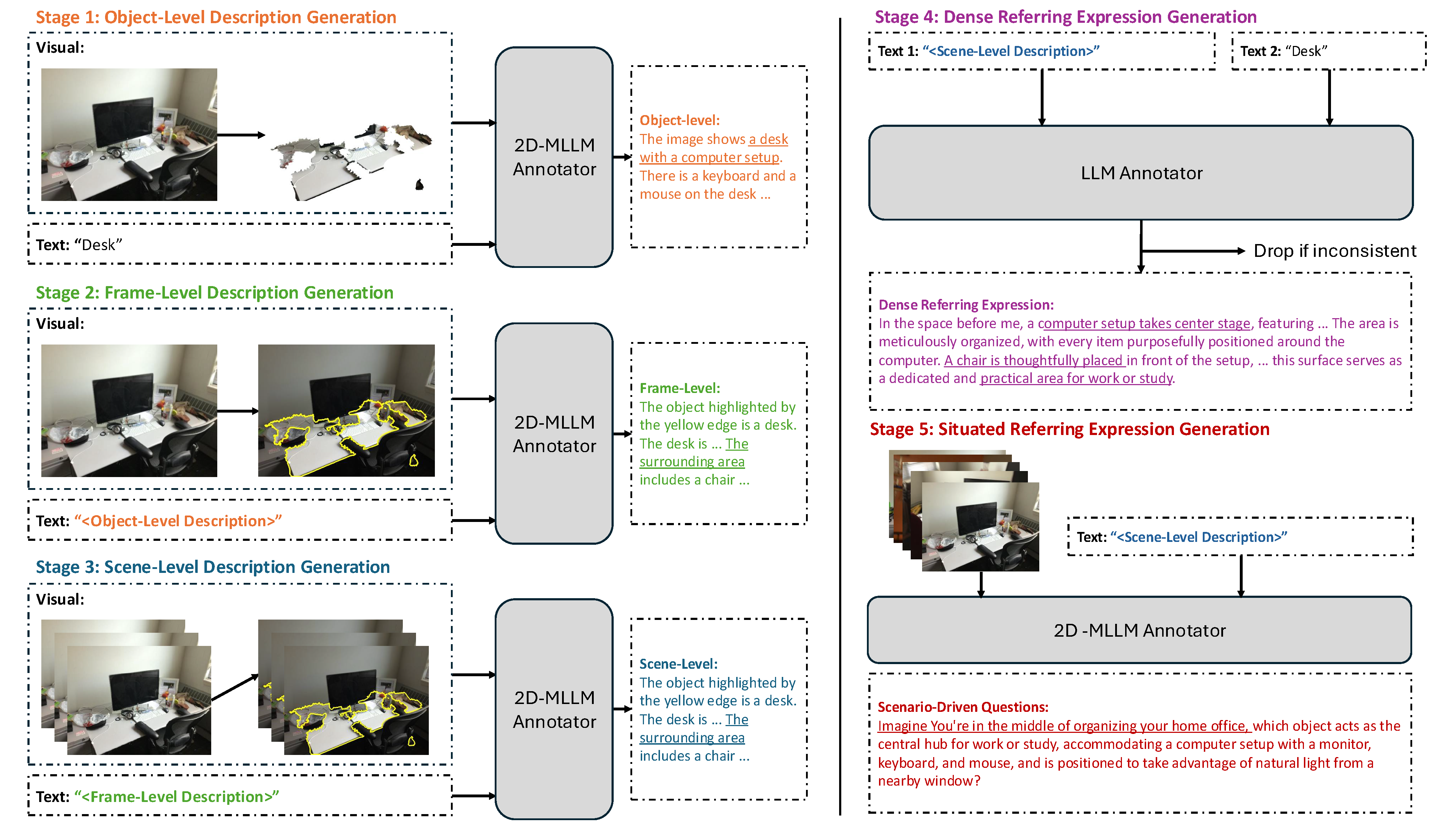 We introduce DenseScan, a novel dataset with detailed multi-level descriptions generated by an automated pipeline leveraging multi-view 2D images and multimodal large language models (MLLMs).